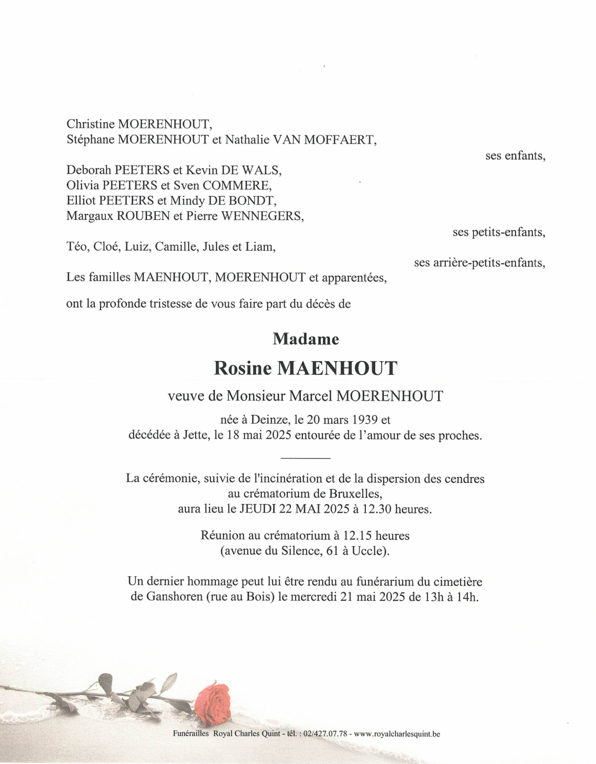 Décédée à Jette (1090) le dimanche 18 mai 2025 à l'âge de 86 ans